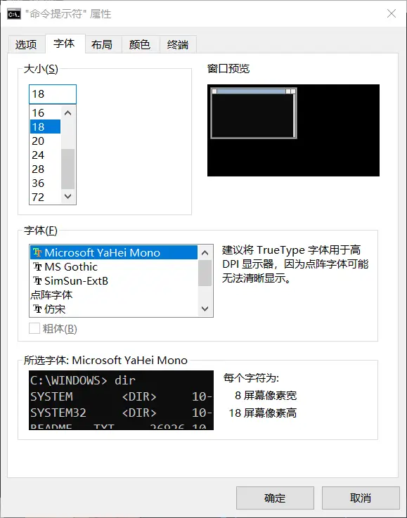 下载完成后,解压并安装其中的字体。此时再打开命令提示符,在「属性 > 字体」中即可选中并使用,建议将字体大小调高到 18。